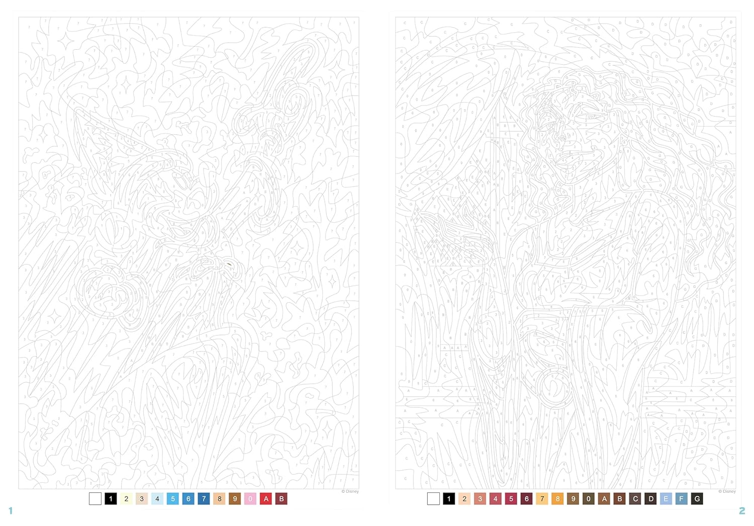 Color by number – follow the color code to uncover stunning Disney illustrations!