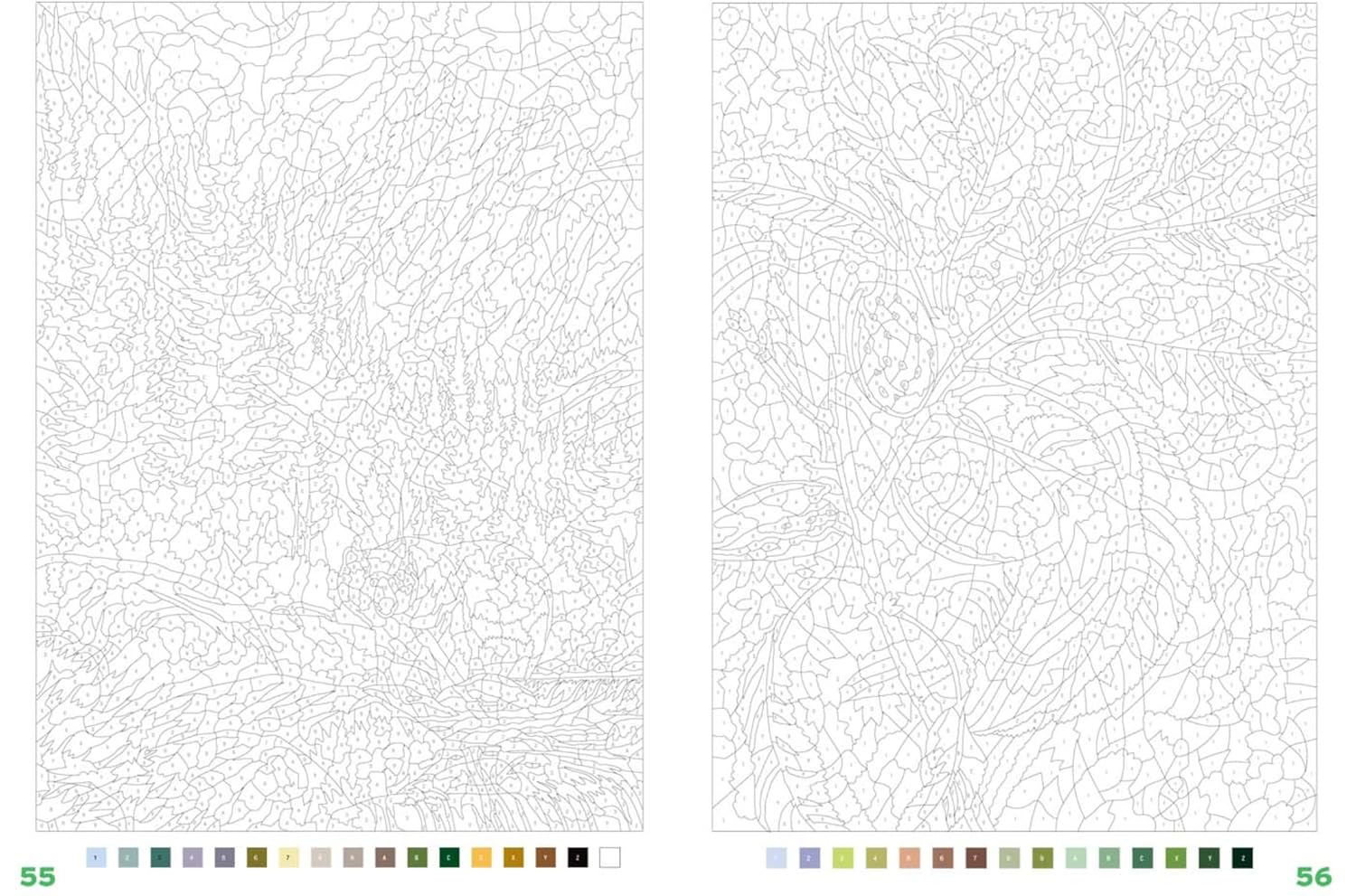 Using simple colored pencils or markers, color each numbered section by following the color code to uncover 100 brand-new illustrations, bringing stunning landscapes and remarkable trees to life.