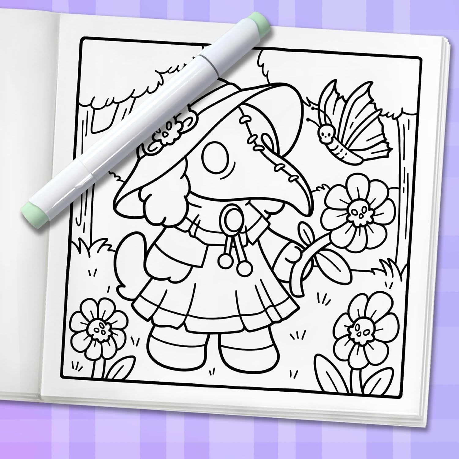 This cute coloring book for adults and teens includes a variety of spooky scenes with adorable animals in cozy situations. Our coloring pages are drawn with thick lines, so they are easy-to-color with markers.